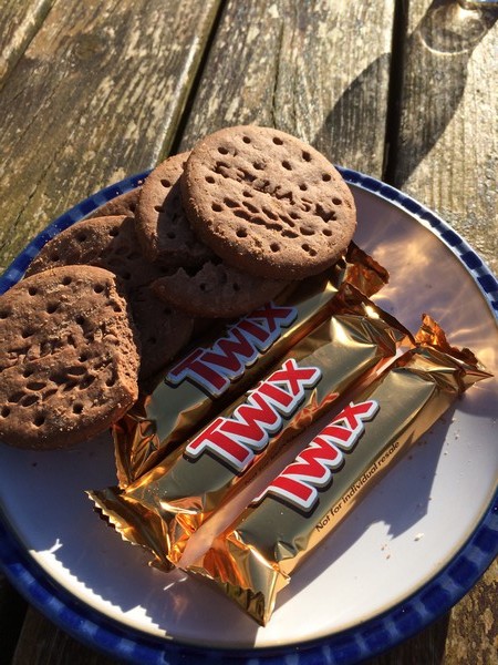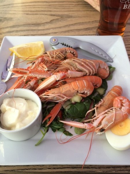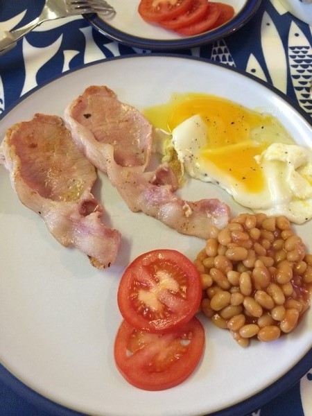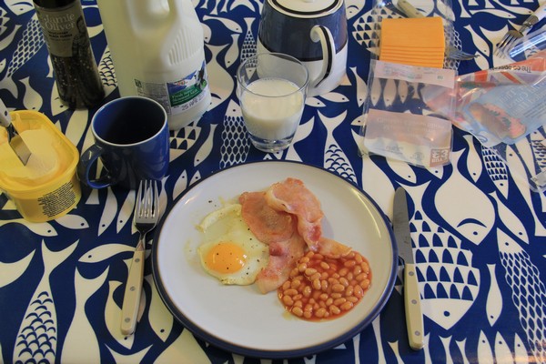 Efter en skön promenad blir det frukost med ägg, bacon, bönor, te rostat bröd m.m. som det ska vara i Skottland!