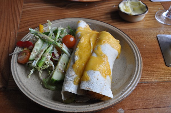 Det blir kycklingtortilla för oss alla och det smakar väldigt bra, mycket smak.