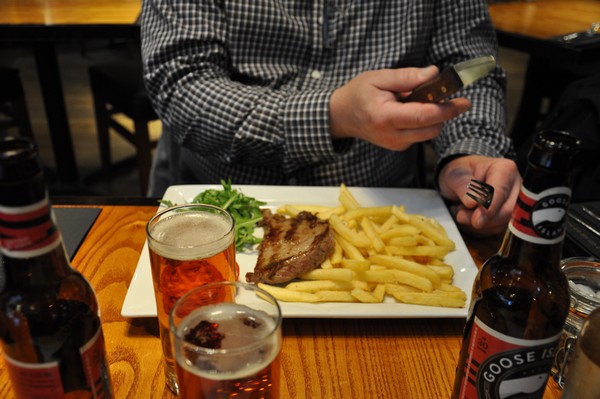 Hamburgaren är nog den äckligaste vi käkat men hungern gör att den åker ner, som tur är så smakar ölen bättre...